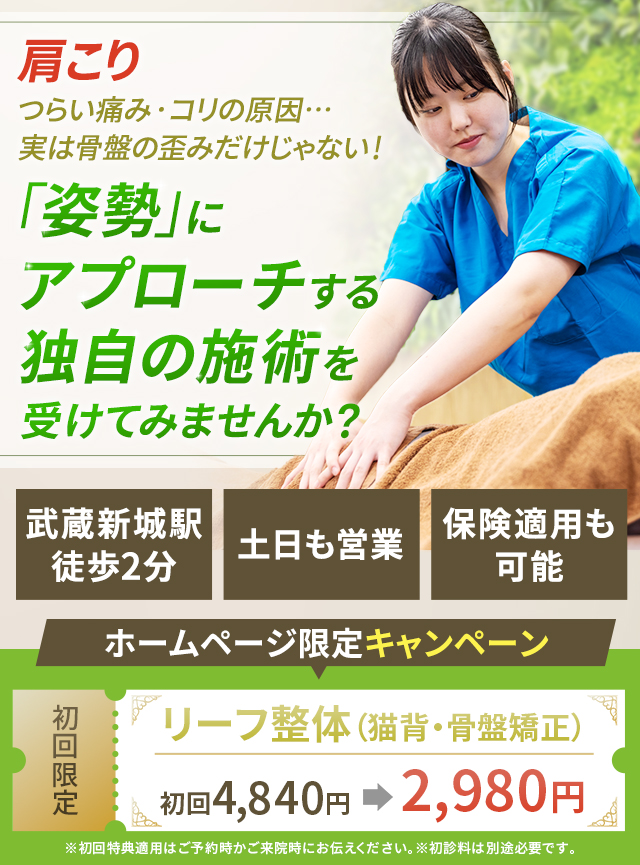リーフ・かなで整骨院グループのリーフ整骨院 武蔵新城院では肩こりでお悩みの方が多数来院され、改善した例も多くあります。