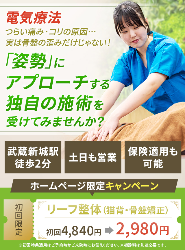 なかなか取れない痛みでお困りの方は、お気軽にリーフ整骨院 武蔵新城院にご相談ください。