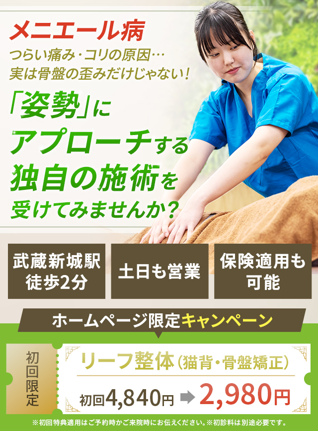 リーフ整骨院 武蔵新城院では、猫背矯正を軸に身体のトータルバランスを向上させることで本来持つ自然治癒力を引き上げる施術を目指しております。